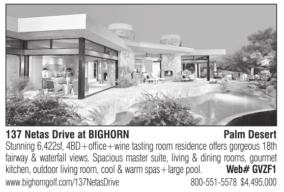137 Netas Drive at BIGHORN Palm Desert Stunning 6,422sf, 4BD+office+wine tasting room residence offers gorgeous 18th fairway & waterfall views. Spacious master suite, living & dining rooms, gourmet kitchen, outdoor living room, cool & warm spas+large pool. Web# GVZF1 www.bighorngolf.com/137NetasDrive 800-551-5578 $4,495,000