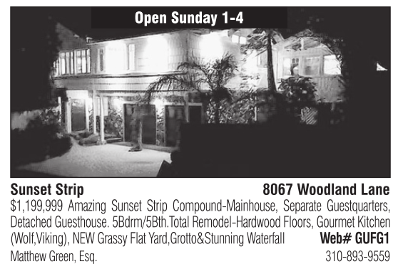 Open Sunday 1-4 Sunset Strip 8067 Woodland Lane $1,199,999 Amazing Sunset Strip Compound-Mainhouse, Separate Guestquarters, Detached Guesthouse. 5Bdrm/5Bth.Total Remodel-Hardwood Floors, Gourmet Kitchen (Wolf,Viking), NEW Grassy Flat Yard,Grotto&Stunning Waterfall Web# GUFG1 Matthew Green, Esq. 310-893-9559 See also