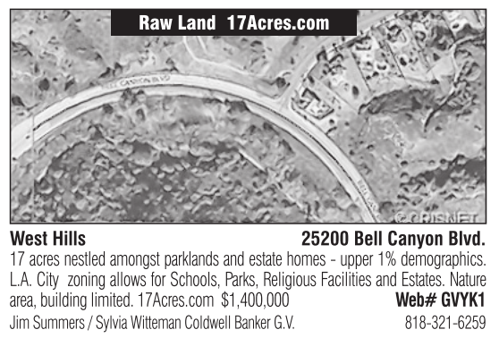 Raw Land 17Acres.com West Hills 25200 Bell Canyon Blvd. 17 acres nestled amongst parklands and estate homes - upper 1% demographics. L.A. City zoning allows for Schools, Parks, Religious Facilities and Estates. Nature area, building limited. 17Acres.com $1,400,000 Web# GVYK1 Jim Summers / Sylvia Witteman Coldwell Banker G.V. 818-321-6259