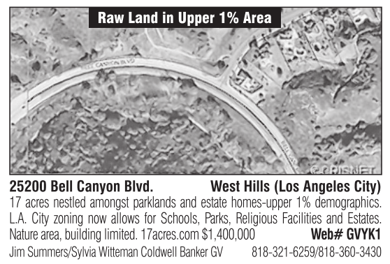 Raw Land in Upper 1% Area 25200 Bell Canyon Blvd. West Hills (Los Angeles City) 17 acres nestled amongst parklands and estate homes-upper 1% demographics. L.A. City zoning now allows for Schools, Parks, Religious Facilities and Estates. Nature area, building limited. 17acres.com $1,400,000 Web# GVYK1 Jim Summers/Sylvia Witteman Coldwell Banker GV 818-321-6259/818-360-3430