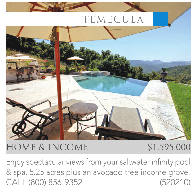 Enjoy spectacular views from your saltwater infinity pool & spa. 5.25 acres plus an avocado tree income grove. CALL (800) 856-9352 (520210)
