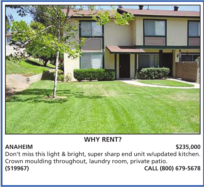 ANAHEIM $235,000 Don’t miss this light & bright, super sharp end unit w/updated kitchen. Crown moulding throughout, laundry room, private patio. (519967) CALL (800) 679-5678