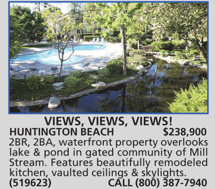 HUNTINGTON BEACH $238,900 2BR, 2BA, waterfront property overlooks lake & pond in gated community of Mill Stream. Features beautifully remodeled kitchen, vaulted ceilings & skylights.