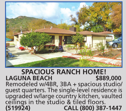 LAGUNA BEACH $889,000 Remodeled w/4BR, 3BA + spacious studio/ guest quarters. The single-level residence is upgraded w/large country kitchen, vaulted ceilings in the studio & tiled floors.