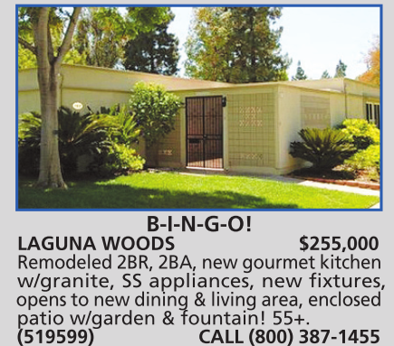LAGUNA WOODS $255,000 Remodeled 2BR, 2BA, new gourmet kitchen w/granite, SS appliances, new fixtures, opens to new dining & living area, enclosed patio w/garden & fountain! 55+. (519599) CALL (800) 387-1455