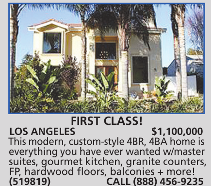 LOS ANGELES $1,100,000 This modern, custom-style 4BR, 4BA home is everything you have ever wanted w/master suites, gourmet kitchen, granite counters, FP, hardwood floors, balconies + more! (519819) CALL (888) 456-9235