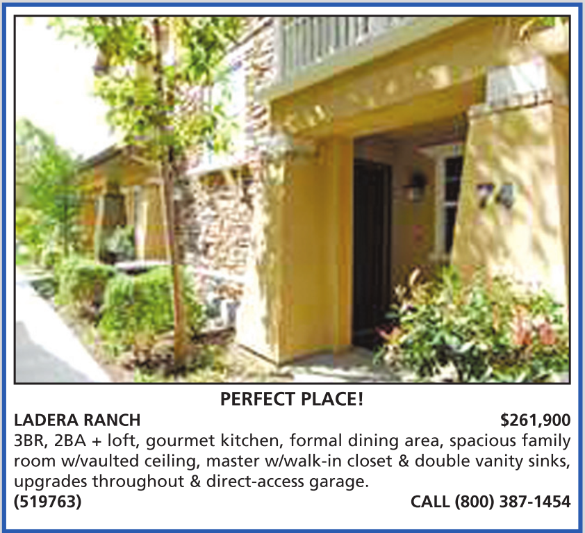PERFECT PLACE! LADERA RANCH $261,900 3BR, 2BA + loft, gourmet kitchen, formal dining area, spacious family room w/vaulted ceiling, master w/walk-in closet & double vanity sinks, upgrades throughout & direct-access garage. (519763) CALL (800) 387-1454