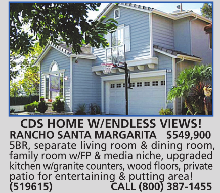 CDS HOME W/ENDLESS VIEWS! RANCHO SANTA MARGARITA $549,900 5BR, separate living room & dining room, family room w/FP & media niche, upgraded kitchen w/granite counters, wood floors, private patio for entertaining & putting area! (519615) CALL (800) 387-1455