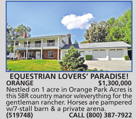 ORANGE $1,300,000 Nestled on 1 acre in Orange Park Acres is this 5BR country manor w/everything for the gentleman rancher. Horses are pampered w/7-stall barn & a private arena. (519748) CALL (800) 387-7922