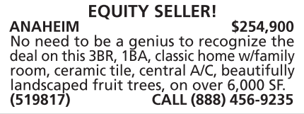 ANAHEIM $254,900 No need to be a genius to recognize the deal on this 3BR, 1BA, classic home w/family room, ceramic tile, central A/C, beautifully landscaped fruit trees, on over 6,000 SF. (519817) CALL (888) 456-9235