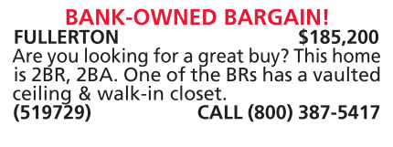FULLERTON $185,200 Are you looking for a great buy? This home is 2BR, 2BA. One of the BRs has a vaulted ceiling & walk-in closet. (519729) CALL (800) 387-5417