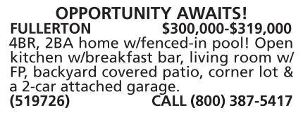 FULLERTON $300,000-$319,000 4BR, 2BA home w/fenced-in pool! Open kitchen w/breakfast bar, living room w/ FP, backyard covered patio, corner lot & a 2-car attached garage. (519726) CALL (800) 387-5417