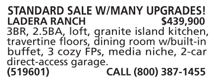 STANDARD SALE W/MANY UPGRADES! LADERA RANCH $439,900 3BR, 2.5BA, loft, granite island kitchen, travertine floors, dining room w/built-in buffet, 3 cozy FPs, media niche, 2-car direct-access garage.