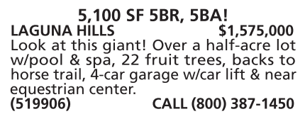 LAGUNA HILLS $1,575,000 Look at this giant! Over a half-acre lot w/pool & spa, 22 fruit trees, backs to horse trail, 4-car garage w/car lift & near equestrian center. (519906) CALL (800) 387-1450