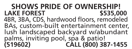 LAKE FOREST $535,000 4BR, 3BA, CDS, hardwood floors, remodeled BAs, custom-built entertainment center, lush landscaped backyard w/abundant palms, inviting pool, spa & patio! (519602) CALL (800) 387-1455