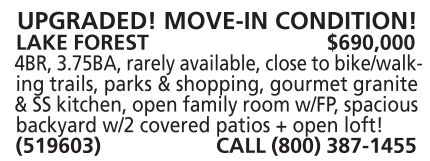 UPGRADED! MOVE-IN CONDITION! LAKE FOREST $690,000 4BR, 3.75BA, rarely available, close to bike/walking trails, parks & shopping, gourmet granite & SS kitchen, open family room w/FP, spacious backyard w/2 covered patios + open loft! (519603) CALL (800) 387-1455