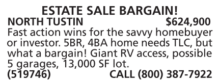 NORTH TUSTIN $624,900 Fast action wins for the savvy homebuyer or investor. 5BR, 4BA home needs TLC, but what a bargain! Giant RV access, possible 5 garages, 13,000 SF lot. (519746) CALL (800) 387-7922