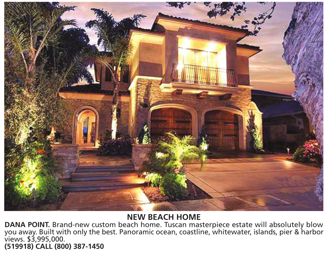 NEW BEACH HOME DANA POINT. Brand-new custom beach home. Tuscan masterpiece estate will absolutely blow you away. Built with only the best. Panoramic ocean, coastline, whitewater, islands, pier & harbor views. $3,995,000. (519918) CALL (800) 387-1450