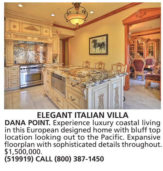ELEGANT ITALIAN VILLA DANA POINT. Experience luxury coastal living in this European designed home with bluff top location looking out to the Pacific. Expansive floorplan with sophisticated details throughout. $1,500,000. (519919) CALL (800) 387-1450