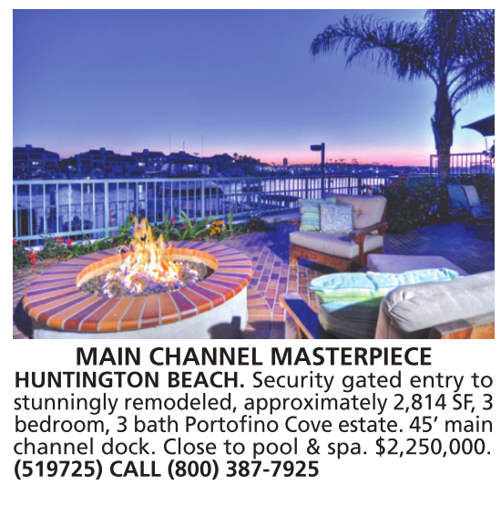MAIN CHANNEL MASTERPIECE HUNTINGTON BEACH. Security gated entry to stunningly remodeled, approximately 2,814 SF, 3 bedroom, 3 bath Portofino Cove estate. 45’ main channel dock. Close to pool & spa. $2,250,000. (519725) CALL (800) 387-7925