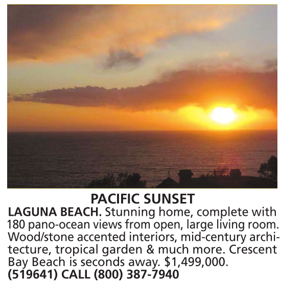 PACIFIC SUNSET LAGUNA BEACH. Stunning home, complete with 180 pano-ocean views from open, large living room. Wood/stone accented interiors, mid-century architecture, tropical garden & much more. Crescent Bay Beach is seconds away. $1,499,000. (519641) CALL (800) 387-7940