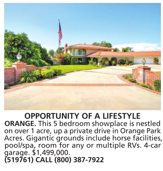 OPPORTUNITY OF A LIFESTYLE ORANGE. This 5 bedroom showplace is nestled on over 1 acre, up a private drive in Orange Park Acres. Gigantic grounds include horse facilities, pool/spa, room for any or multiple RVs. 4-car garage. $1,499,000. (519761) CALL (800) 387-7922