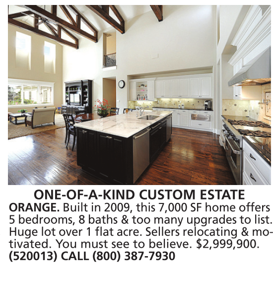 facilities, ONE-OF-A-KIND CUSTOM ESTATE ORANGE. Built in 2009, this 7,000 SF home offers 5 bedrooms, 8 baths & too many upgrades to list. Huge lot over 1 flat acre. Sellers relocating & motivated. You must see to believe. $2,999,900. (520013) CALL (800) 387-7930