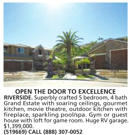 OPEN THE DOOR TO EXCELLENCE RIVERSIDE. Superbly crafted 5 bedroom, 4 bath Grand Estate with soaring ceilings, gourmet kitchen, movie theatre, outdoor kitchen with fireplace, sparkling pool/spa. Gym or guest house with loft for game room. Huge RV garage. $1,399,000. (519669) CALL (888) 307-0052