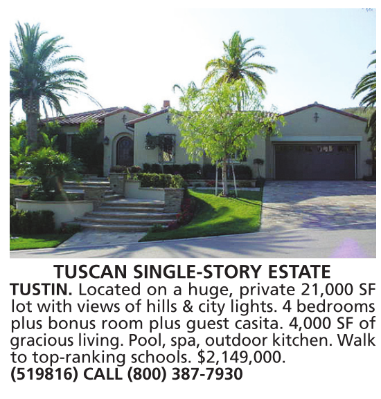 TUSCAN SINGLE-STORY ESTATE TUSTIN. Located on a huge, private 21,000 SF lot with views of hills & city lights. 4 bedrooms plus bonus room plus guest casita. 4,000 SF of gracious living. Pool, spa, outdoor kitchen. Walk to top-ranking schools. $2,149,000. (519816) CALL (800) 387-7930