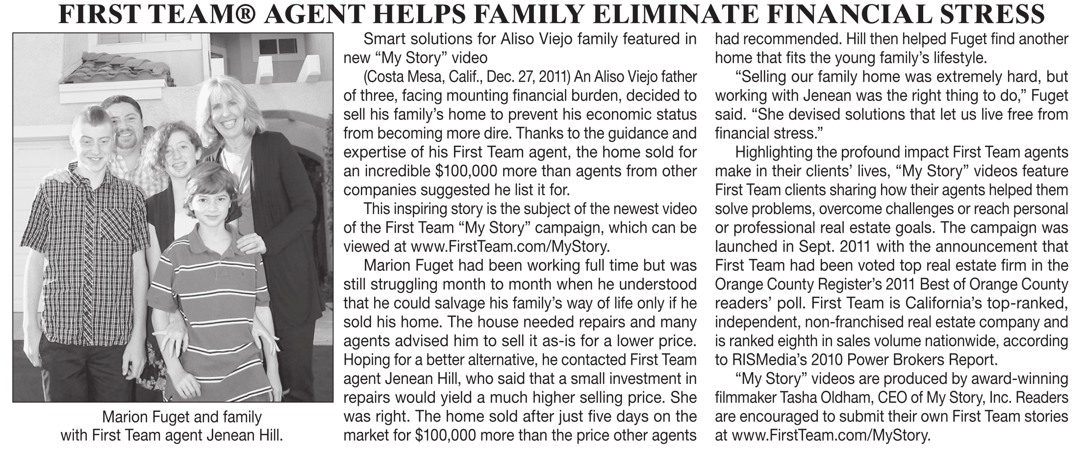 Smart solutions for Aliso Viejo family featured in new “My Story” video (Costa Mesa, Calif., Dec. 27, 2011) An Aliso Viejo father of three, facing mounting financial burden, decided to sell his family’s home to prevent his economic status from becoming more dire. Thanks to the guidance and expertise of his First Team agent, the home sold for an incredible $100,000 more than agents from other companies suggested he list it for.