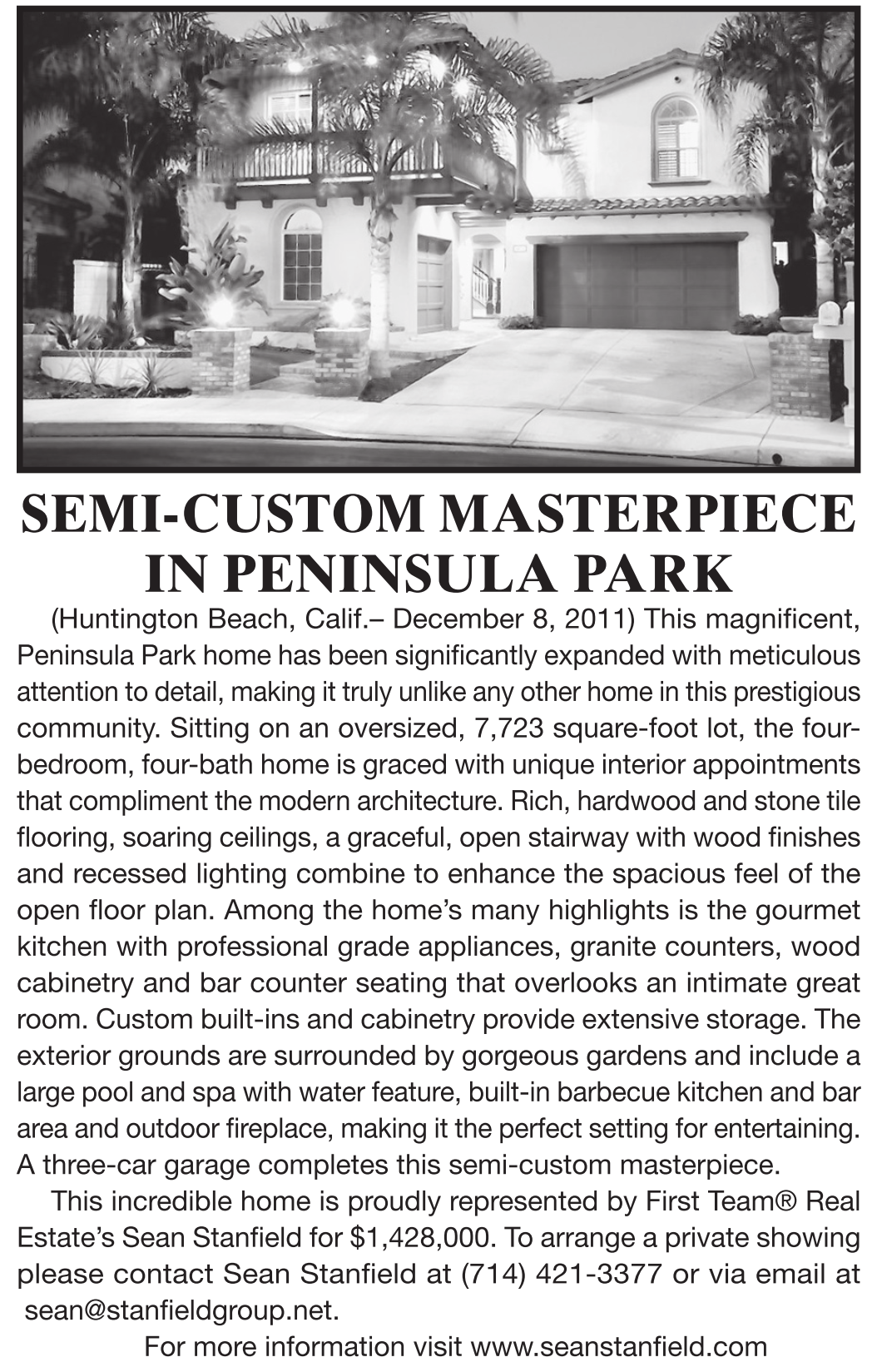 SEMI-CUSTOM MASTERPIECE IN PENINSULA PARK (Huntington Beach, Calif.– December 8, 2011) This magnificent, Peninsula Park home has been significantly expanded with meticulous attention to detail, making it truly unlike any other home in this prestigious community. Sitting on an oversized, 7,723 square-foot lot, the fourbedroom, four-bath home is graced with unique interior appointments that compliment the modern architecture. Rich, hardwood and stone tile flooring, soaring ceilings, a graceful, open stairway with wood finishes and recessed lighting combine to enhance the spacious feel of the open floor plan. Among the home’s many highlights is the gourmet kitchen with professional grade appliances, granite counters, wood cabinetry and bar counter seating that overlooks an intimate great room. Custom built-ins and cabinetry provide extensive storage. The exterior grounds are surrounded by gorgeous gardens and include a large pool and spa with water feature, built-in barbecue kitchen and bar area and outdoor fireplace, making it the perfect setting for entertaining. A three-car garage completes this semi-custom masterpiece. This incredible home is proudly represented by First Team® Real Estate’s Sean Stanfield for $1,428,000. To arrange a private showing please contact Sean Stanfield at (714) 421-3377 or via email at sean@stanfieldgroup.net. For more information visit www.seanstanfield.com