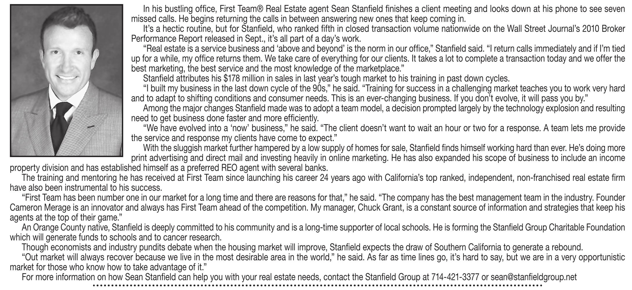 It’s a hectic routine, but for Stanfield, who ranked fifth in closed transaction volume nationwide on the Wall Street Journal’s 2010 Broker Performance Report released in Sept., it’s all part of a day’s work.
