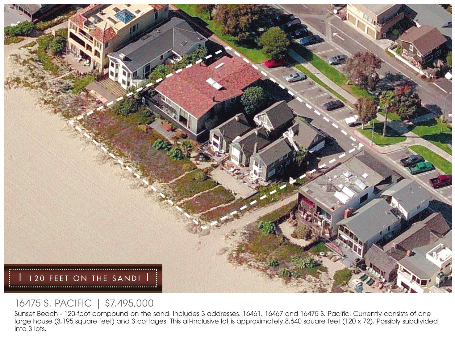 Sunset Beach - 120-foot compound on the sand. Includes 3 addresses. 16461, 16467 and 16475 S. Pacific. Currently consists of one large house (3,195 square feet) and 3 cottages. This all-inclusive lot is approximately 8,640 square feet (120 x 72). Possibly subdivided into 3 lots.