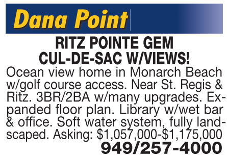 Dana Point RITZ POINTE GEM CUL-DE-SAC W/VIEWS! Ocean view home in Monarch Beach w/golf course access. Near St. Regis & Ritz. 3BR/2BA w/many upgrades. Expanded floor plan. Library w/wet bar & office. Soft water system, fully landscaped. Asking: $1,057,000-$1,175,000 949/257-4000