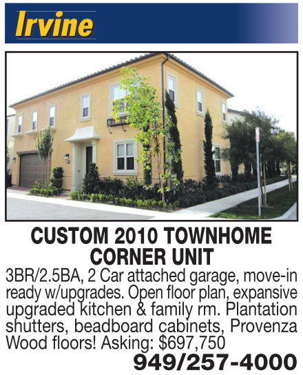 CUSTOM 2010 TOWNHOME CORNER UNIT 3BR/2.5BA, 2 Car attached garage, move-in ready w/upgrades. Open floor plan, expansive upgraded kitchen & family rm. Plantation shutters, beadboard cabinets, Provenza Wood floors! Asking: $697,750 949/257-4000