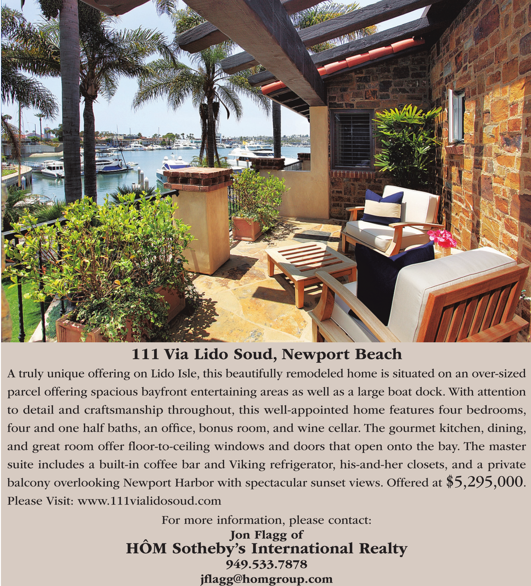111 Via Lido Soud, Newport Beach A truly unique offering on Lido Isle, this beautifully remodeled home is situated on an over-sized parcel offering spacious bayfront entertaining areas as well as a large boat dock. With attention to detail and craftsmanship throughout, this well-appointed home features four bedrooms, four and one half baths, an office, bonus room, and wine cellar. The gourmet kitchen, dining, and great room offer floor-to-ceiling windows and doors that open onto the bay. The master suite includes a built-in coffee bar and Viking refrigerator, his-and-her closets, and a private balcony overlooking Newport Harbor with spectacular sunset views. Offered at $5,295,000. Please Visit: www.111vialidosoud.com For more information, please contact: Jon Flagg of HÔM Sotheby’s International Realty 949.533.7878 jflagg@homgroup.com
