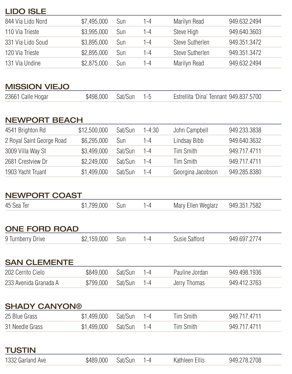 NEWPORT BEACH 4541 Brighton Rd $12,500,000 Sat/Sun 1-4:30 John Campbell 949.233.3838 2 Royal Saint George Road $6,295,000 Sun 1-4 Lindsay Bibb 949.640.3632 3009 Villa Way St $3,499,000 Sat/Sun 1-4 Tim Smith 949.717.4711 2681 Crestview Dr $2,249,000 Sat/Sun 1-4 Tim Smith 949.717.4711 1903 Yacht Truant $1,499,000 Sat/Sun 1-4 Georgina Jacobson 949.285.8380