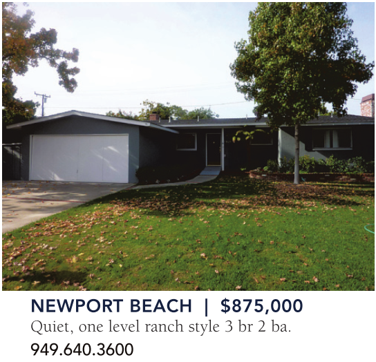 NEWPORT BEACH | $875,000 Quiet, one level ranch style 3 br 2 ba. 949.640.3600