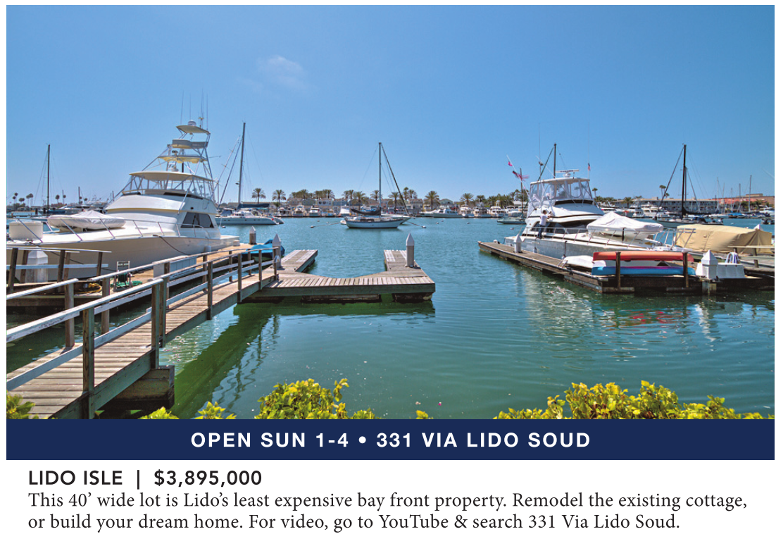 LIDO ISLE | $3,895,000 This 40’ wide lot is Lido’s least expensive bay front property. Remodel the existing cottage, or build your dream home. For video, go to YouTube & search 331 Via Lido Soud.