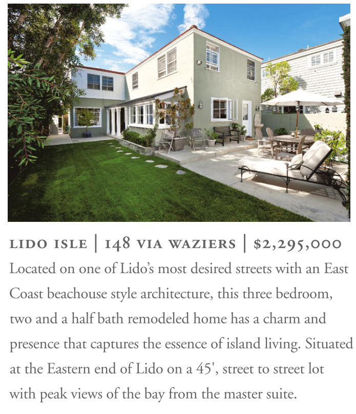 lido isle | 148 via waziers | $2,295,000 Located on one of Lido’s most desired streets with an East Coast beachouse style architecture, this three bedroom, two and a half bath remodeled home has a charm and presence that captures the essence of island living. Situated at the Eastern end of Lido on a 45', street to street lot with peak views of the bay from the master suite.