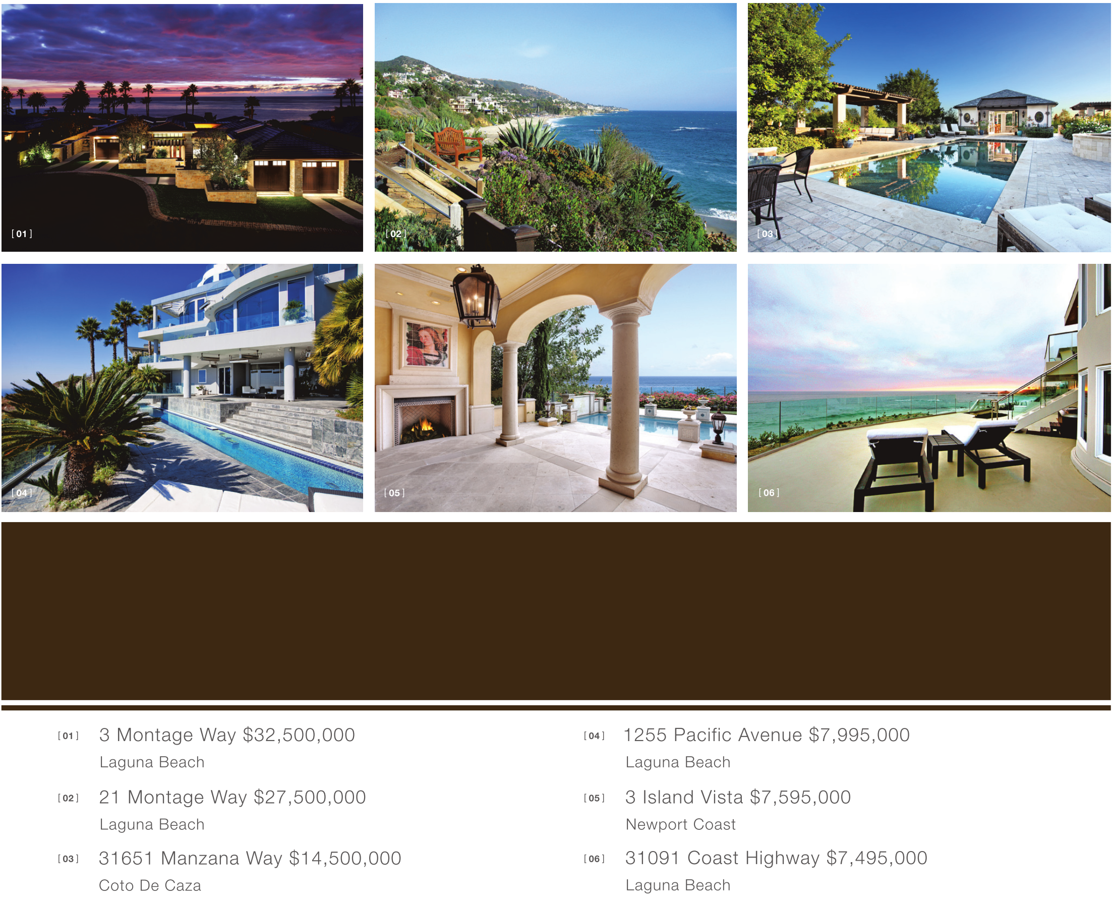 [ 01 ] [ 02 ] [ 03 ] [ 04 ] [ 05 ] [ 06 ] [ 01 ] [ 02 ] [ 03 ] 3 Montage Way $32,500,000 Laguna Beach 21 Montage Way $27,500,000 Laguna Beach 31651 Manzana Way $14,500,000 Coto De Caza [ 04 ] [ 05 ] [ 06 ] 1255 Pacific Avenue $7,995,000 Laguna Beach 3 Island Vista $7,595,000 Newport Coast 31091 Coast Highway $7,495,000 Laguna Beach