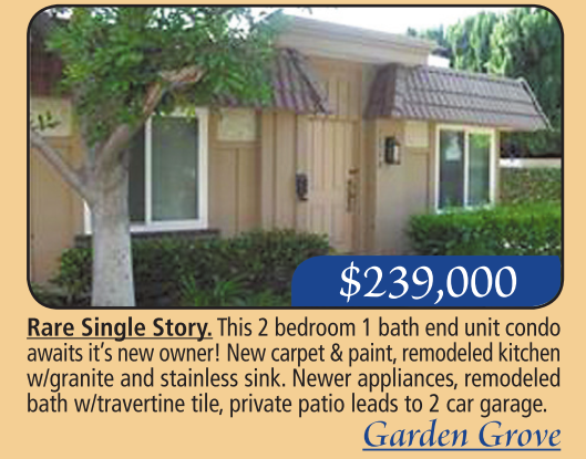 $239,000 Rare Single Story. This 2 bedroom 1 bath end unit condo awaits it’s new owner! New carpet & paint, remodeled kitchen w/granite and stainless sink. Newer appliances, remodeled bath w/travertine tile, private patio leads to 2 car garage. Garden Grove