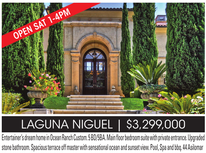 LAGUNA NIGUEL | $3,299,000 Entertainer’s dream home in Ocean Ranch Custom. 5 BD/5BA. Main floor bedroom suite with private entrance. Upgraded stone bathroom. Spacious terrace off master with sensational ocean and sunset view. Pool, Spa and bbq. 44 Asilomar