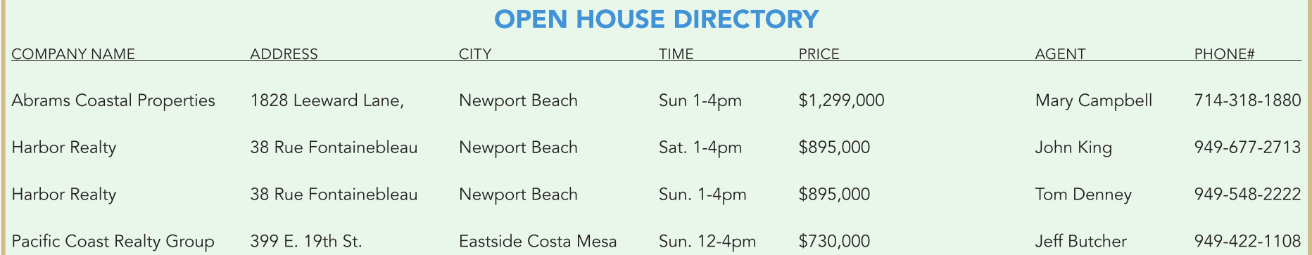 Pacific Coast Realty Group 399 E. 19th St. Eastside Costa Mesa Sun. 12-4pm $730,000 Jeff Butcher 949-422-1108