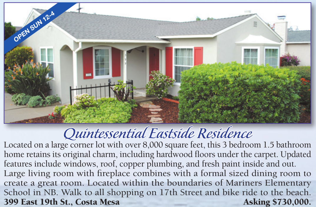 home retains its original charm, including hardwood floors under the carpet. Updated features include windows, roof, copper plumbing, and fresh paint inside and out. Large living room with fireplace combines with a formal sized dining room to create a great room. Located within the boundaries of Mariners Elementary School in NB. Walk to all shopping on 17th Street and bike ride to the beach. 399 East 19th St., Costa Mesa Asking $730,000.