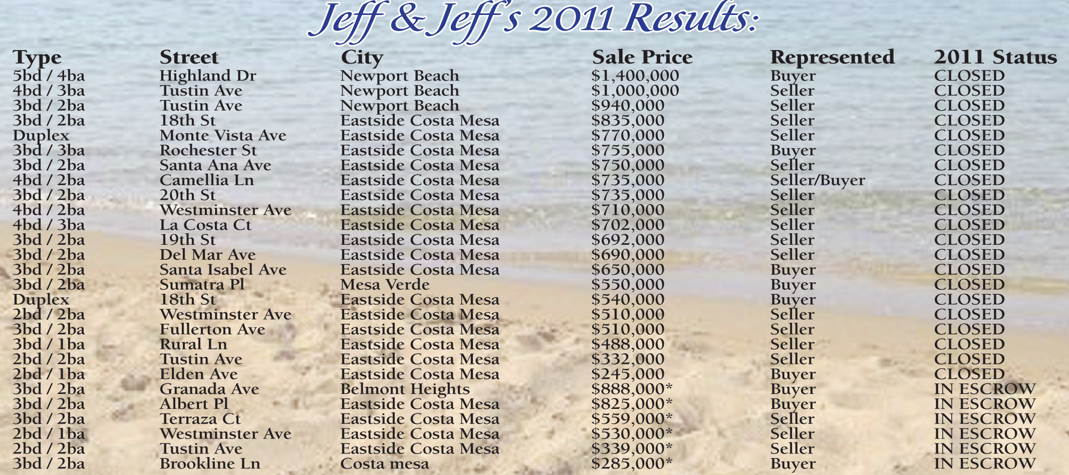 5bd / 4ba Highland Dr Newport Beach $1,400,000 Buyer CLOSED 4bd / 3ba Tustin Ave Newport Beach $1,000,000 Seller CLOSED 3bd / 2ba Tustin Ave Newport Beach $940,000 Seller CLOSED 3bd / 2ba 18th St Eastside Costa Mesa $835,000 Seller CLOSED Duplex Monte Vista Ave Eastside Costa Mesa $770,000 Seller CLOSED 3bd / 3ba Rochester St Eastside Costa Mesa $755,000 Buyer CLOSED 3bd / 2ba Santa Ana Ave Eastside Costa Mesa $750,000 Seller CLOSED 4bd / 2ba Camellia Ln Eastside Costa Mesa $735,000 Seller/Buyer CLOSED 3bd / 2ba 20th St Eastside Costa Mesa $735,000 Seller CLOSED 4bd / 2ba Westminster Ave Eastside Costa Mesa $710,000 Seller CLOSED 4bd / 3ba La Costa Ct Eastside Costa Mesa $702,000 Seller CLOSED 3bd / 2ba 19th St Eastside Costa Mesa $692,000 Seller CLOSED 3bd / 2ba Del Mar Ave Eastside Costa Mesa $690,000 Seller CLOSED 3bd / 2ba Santa Isabel Ave Eastside Costa Mesa $650,000 Buyer CLOSED 3bd / 2ba Sumatra Pl Mesa Verde $550,000 Buyer CLOSED Duplex 18th St Eastside Costa Mesa $540,000 Buyer CLOSED 2bd / 2ba Westminster Ave Eastside Costa Mesa $510,000 Seller CLOSED 3bd / 2ba Fullerton Ave Eastside Costa Mesa $510,000 Seller CLOSED 3bd / 1ba Rural Ln Eastside Costa Mesa $488,000 Seller CLOSED 2bd / 2ba Tustin Ave Eastside Costa Mesa $332,000 Seller CLOSED 2bd / 1ba Elden Ave Eastside Costa Mesa $245,000 Buyer CLOSED 3bd / 2ba Granada Ave Belmont Heights $888,000* Buyer IN ESCROW 3bd / 2ba Albert Pl Eastside Costa Mesa $825,000* Buyer IN ESCROW 3bd / 2ba Terraza Ct Eastside Costa Mesa $559,000* Seller IN ESCROW 2bd / 1ba Westminster Ave Eastside Costa Mesa $530,000* Seller IN ESCROW 2bd / 2ba Tustin Ave Eastside Costa Mesa $339,000* Seller IN ESCROW 3bd / 2ba Brookline Ln Costa mesa $285,000* Buyer IN ESCROW Prices noted with an “*” are the listing price
