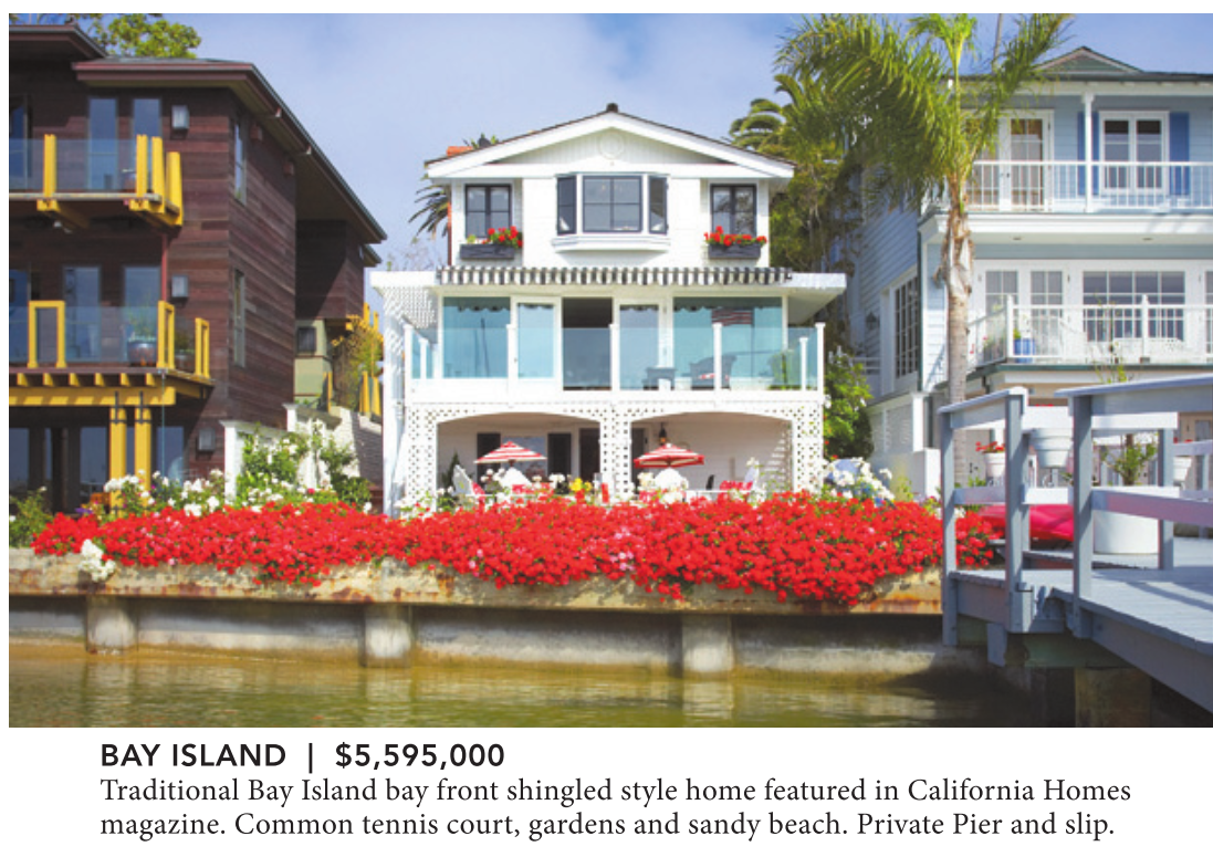 BAY ISLAND | $5,595,000 Traditional Bay Island bay front shingled style home featured in California Homes magazine. Common tennis court, gardens and sandy beach. Private Pier and slip.