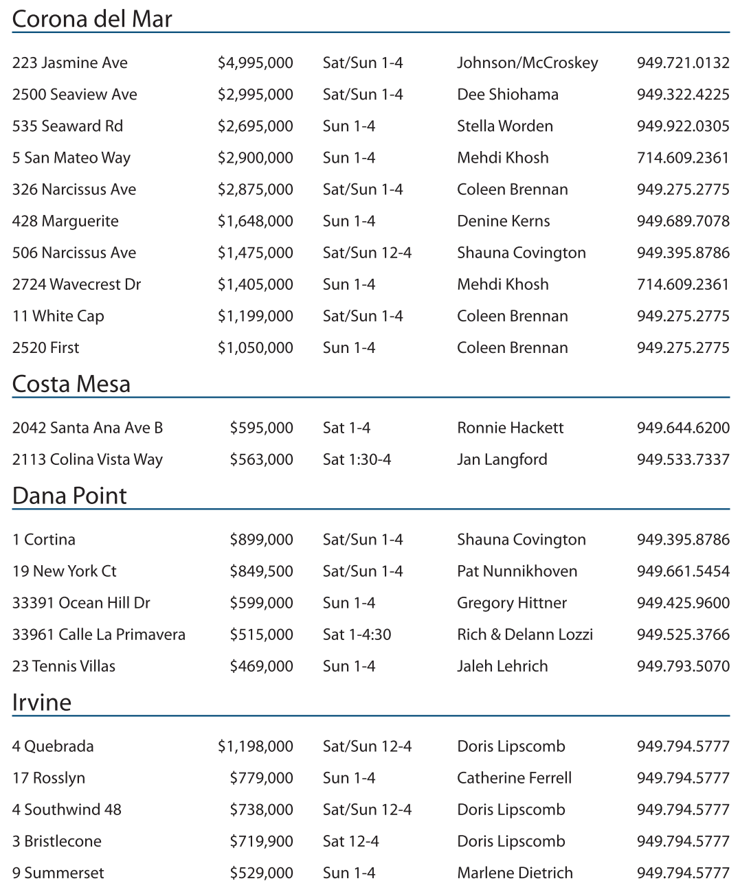 223 Jasmine Ave $4,995,000 Sat/Sun 1-4 Johnson/McCroskey 949.721.0132 2500 Seaview Ave $2,995,000 Sat/Sun 1-4 Dee Shiohama 949.322.4225 535 Seaward Rd $2,695,000 Sun 1-4 Stella Worden 949.922.0305