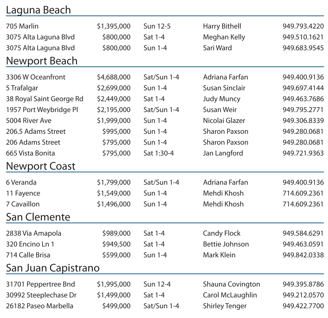 3306 W Oceanfront $4,688,000 Sat/Sun 1-4 Adriana Farfan 949.400.9136 5 Trafalgar $2,699,000 Sun 1-4 Susan Sinclair 949.697.4144 38 Royal Saint George Rd $2,449,000 Sat 1-4 Judy Muncy 949.463.7686 1957 Port Weybridge Pl $2,195,000 Sat/Sun 1-4 Susan Weir 949.795.2771 5004 River Ave $1,999,000 Sun 1-4 Nicolai Glazer 949.306.8339 206.5 Adams Street $995,000 Sun 1-4 Sharon Paxson 949.280.0681 206 Adams Street $795,000 Sun 1-4 Sharon Paxson 949.280.0681 665 Vista Bonita $795,000 Sat 1:30-4 Jan Langford 949.721.9363