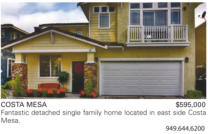 COSTA MESA $595,000 Fantastic detached single family home located in east side Costa Mesa.